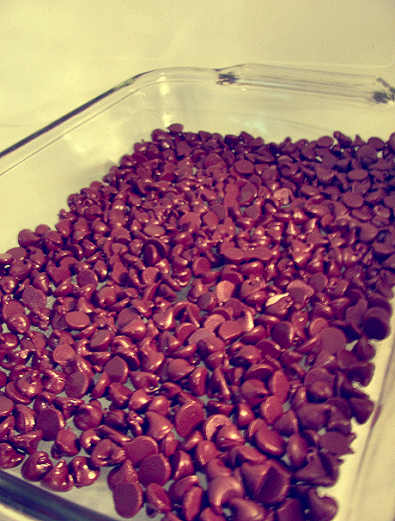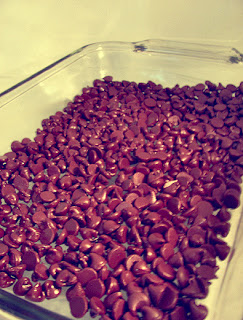 - Pour half the bag of chocolate/carob chips into a microwaveable flat glass container evenly, so all parts of the container are covered.
