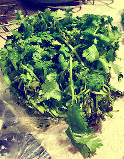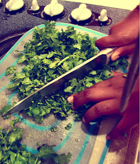 I was originally going to take the cilantro leaves off the stems individually... until my sister showed me this method of just cutting them and including minimal stem. So thanks to her! This is her showing the cutting.