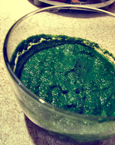 - Chop up the cilantro stalk, trying to get as least of the stem as possible, and add into blender in batches. If mixture becomes too dry, add some water (be careful though; too much water will make it runny!)