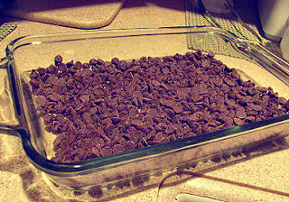 - Pour half the bag of chocolate/carob chips into a microwaveable flat glass container evenly, so all parts of the container are covered.