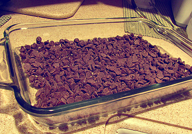 - Add remaining chocolate chips from the bag to the top of the peanut butter and melt in microwave for 3 minutes.